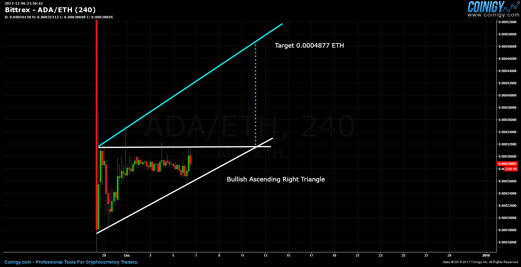 The ADA/ETH pair is sporting a bullish ascending right triangle! The minimum target price run is 0.0004877 ETH!!