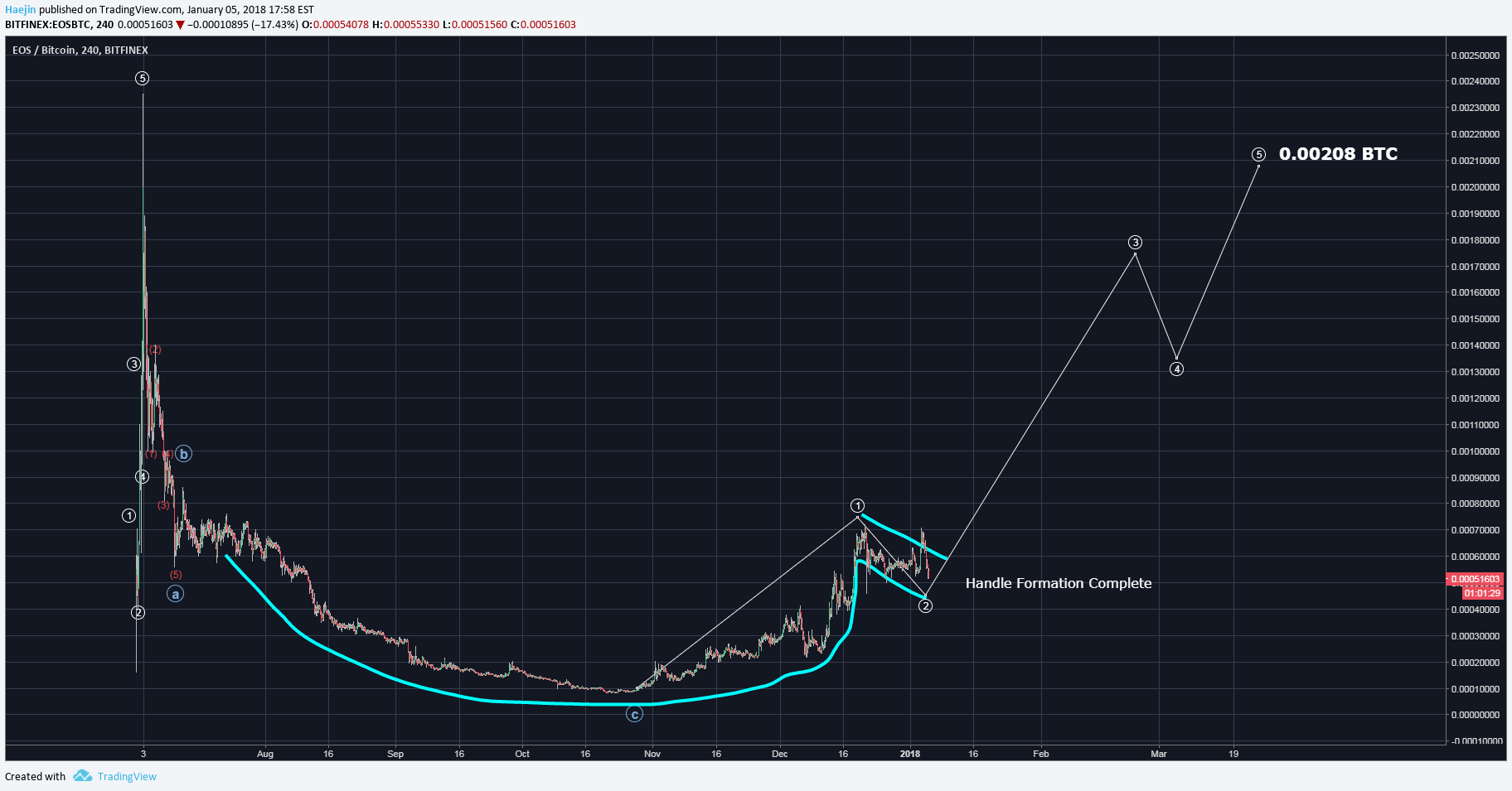 The EOS/BTC is just as amazingly bullish! The handle formation of the Cup & Handle is complete or will be at any moment. I believe this will coincide with the finishing of wave 2 and since wave 3 often moves very violently up...expect MASSIVE PROFITS!!