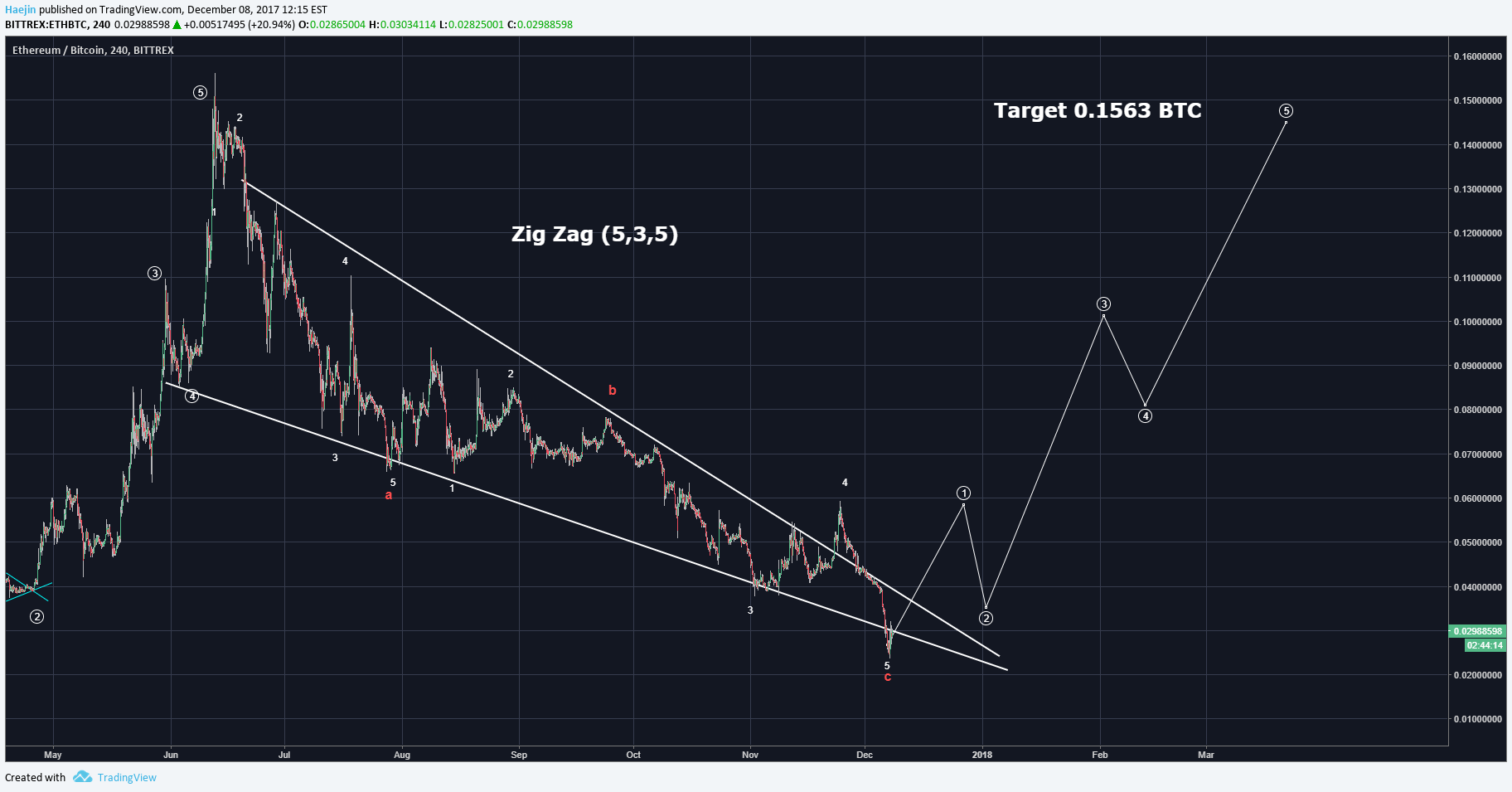 The VERY BULLISH Downward Pointing Symmetrical Triangle is uncanny!! Beauty! It's a zig zag correction where I've also labeled the 5 subwaves of red wave a and the same for wave c. The fact that I use subwaves to provide the geopositioning of price on Elliott Waves is a skill you'll want to perhaps learn. I constantly count the sub waves as my quality control to determine if the correction is correct. So, wave c shows a completed 5 subwaves so it seems highly probable that the correction is all done! Now, let's see if the impulse white waves can take price to 0.1563 BTC or higher!