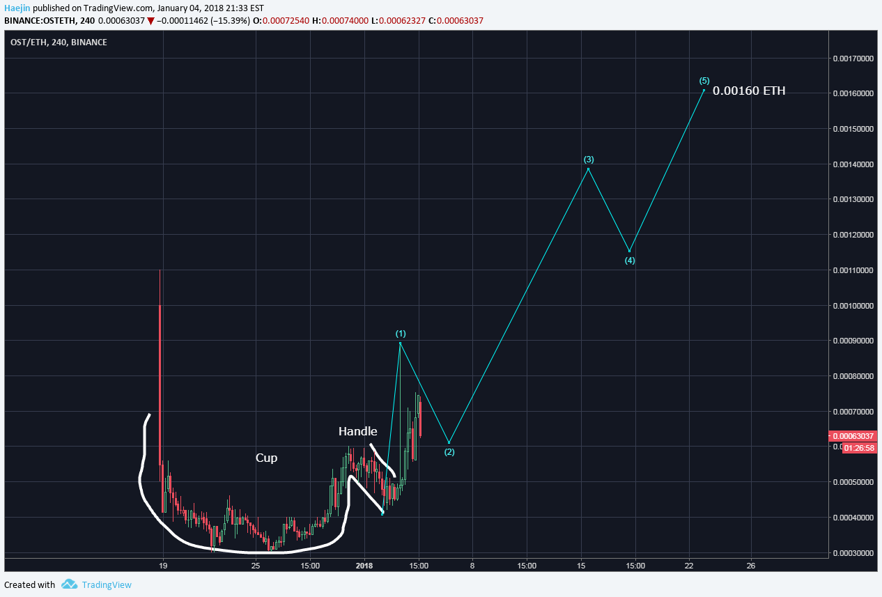 Here is the OST/ETH pair and I almost can't see any difference to the OST/BTC pair. The Cup & Handle is a bit more advanced with the handle already formed and price having broken out. Even compared to the OST/ETH pair, the OST/BTC pair lags! The /BTC pair has always been lagging the /USD pair. Once wave 2 completes, we can expect 0.00160 ETH to be targeted and likely exceeded!!