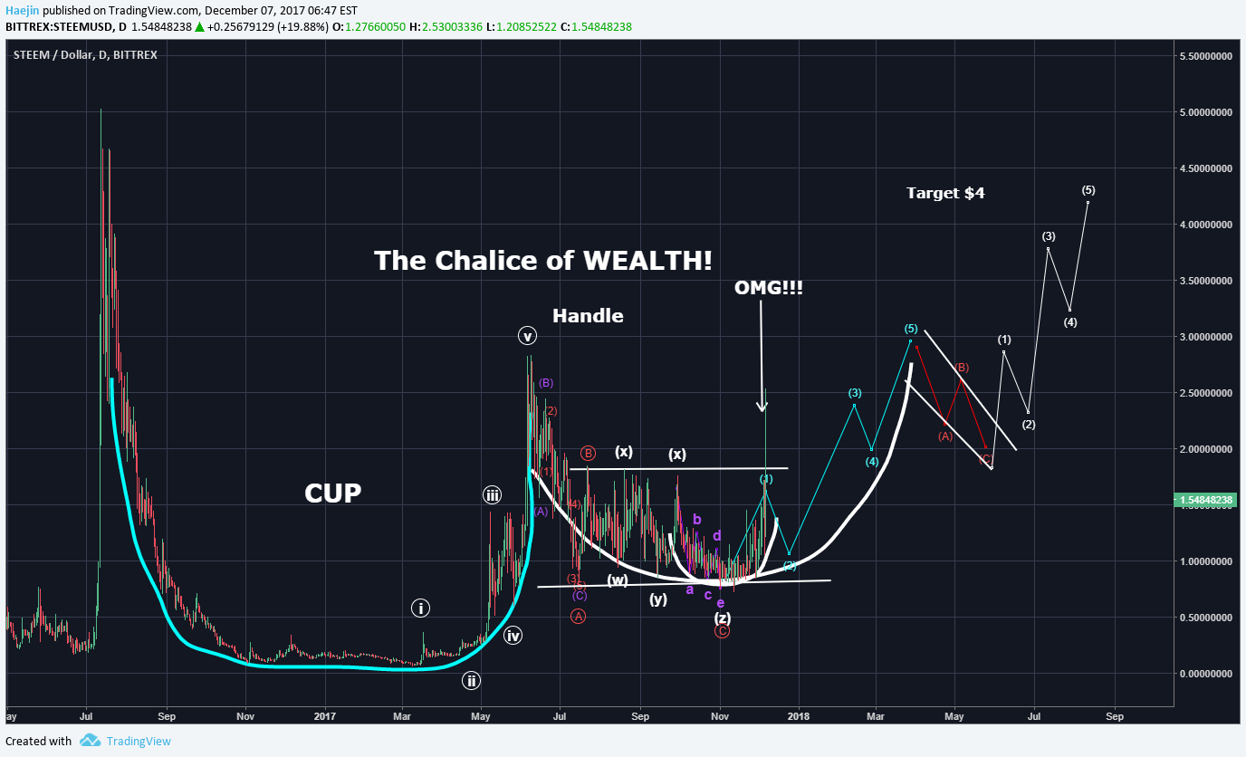 Now, observe the uncanny simlarity between ZEN's Cup & Handle and Price to that of STEEM as shown below. Even the horizontal channel is almost exact between the two. STEEM, the Chalice of WEALTH, too will EXPLODE!! STEEM too is expected to follow in ZEN's footsteps! This makes the lowly $4 target peanuts as I'll be looking for $14 or HIGHER! You ain't seen nothi'n YET!