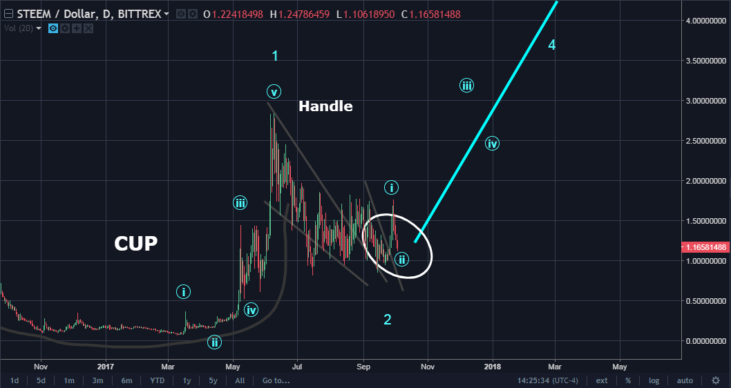 The Chalice of Wealth Shall Not Fail US! STEEM is a keeper and target of $10 could become a distant memory in 12-16 month time frame. HODL this one and accumulate...e.g. BUY the DIPS! From an Elliott Wave perspective, Wave (i) blue is done and Wave (ii) (white circle) is currently in progress and is expected to complete soon. These types of corrections are ideal time to ladder in additional buys! For me, I'm not converting any of my awarded STEEM or SBD to any other coin. It will remain where they are and await the first $4 target and then $10 and higher. (I hope I've earned your upvote, follow and or resteem! Thx)