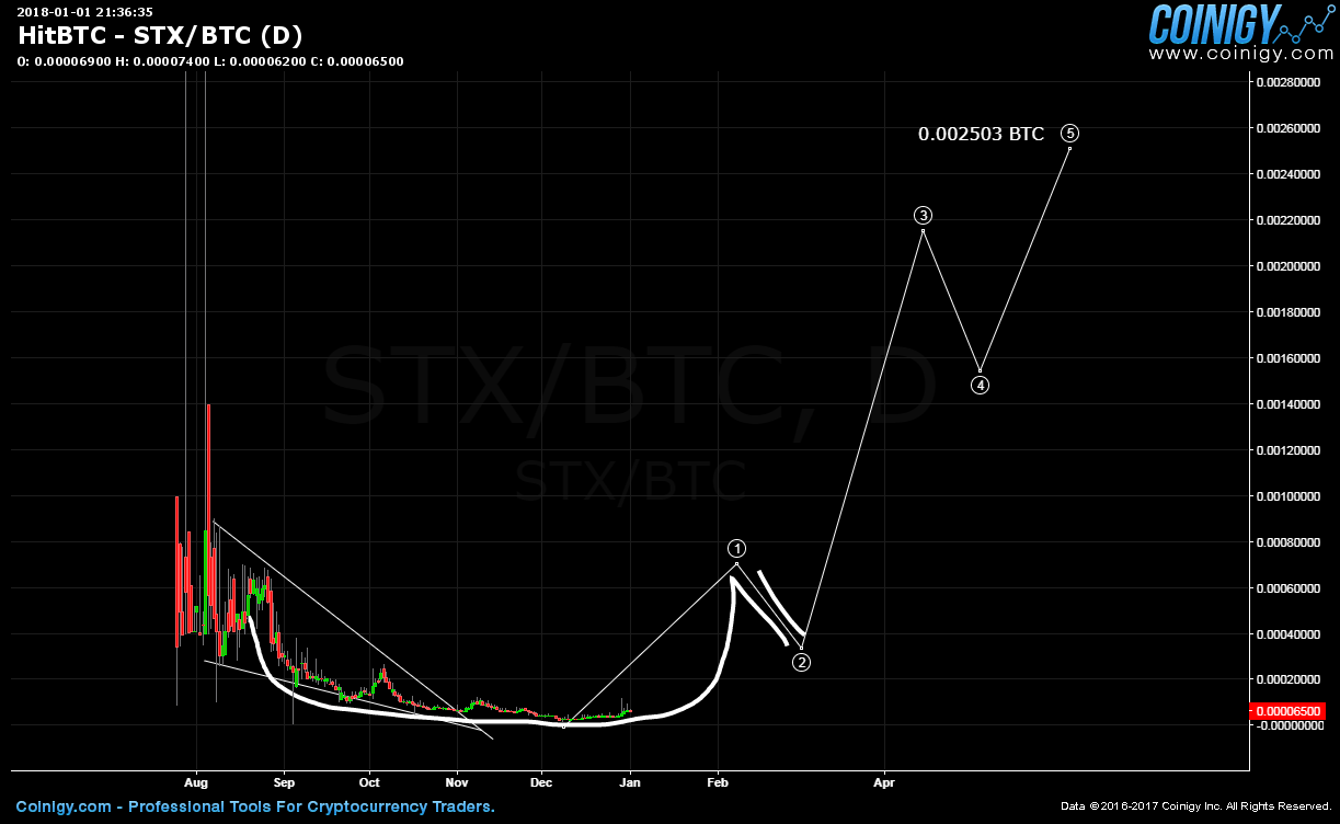 The below is a chart of Stox (STX) and it is just starting to rise through a Cup & Handle bullish pattern. This pattern is quite common in Altcoins and also often slow to complete and confirm. However, once confirmed; it becomes a sight to behold because the uptrend can be sustained for quite a while. I target $5.87 or HIGHER to returna a potential 520%!!