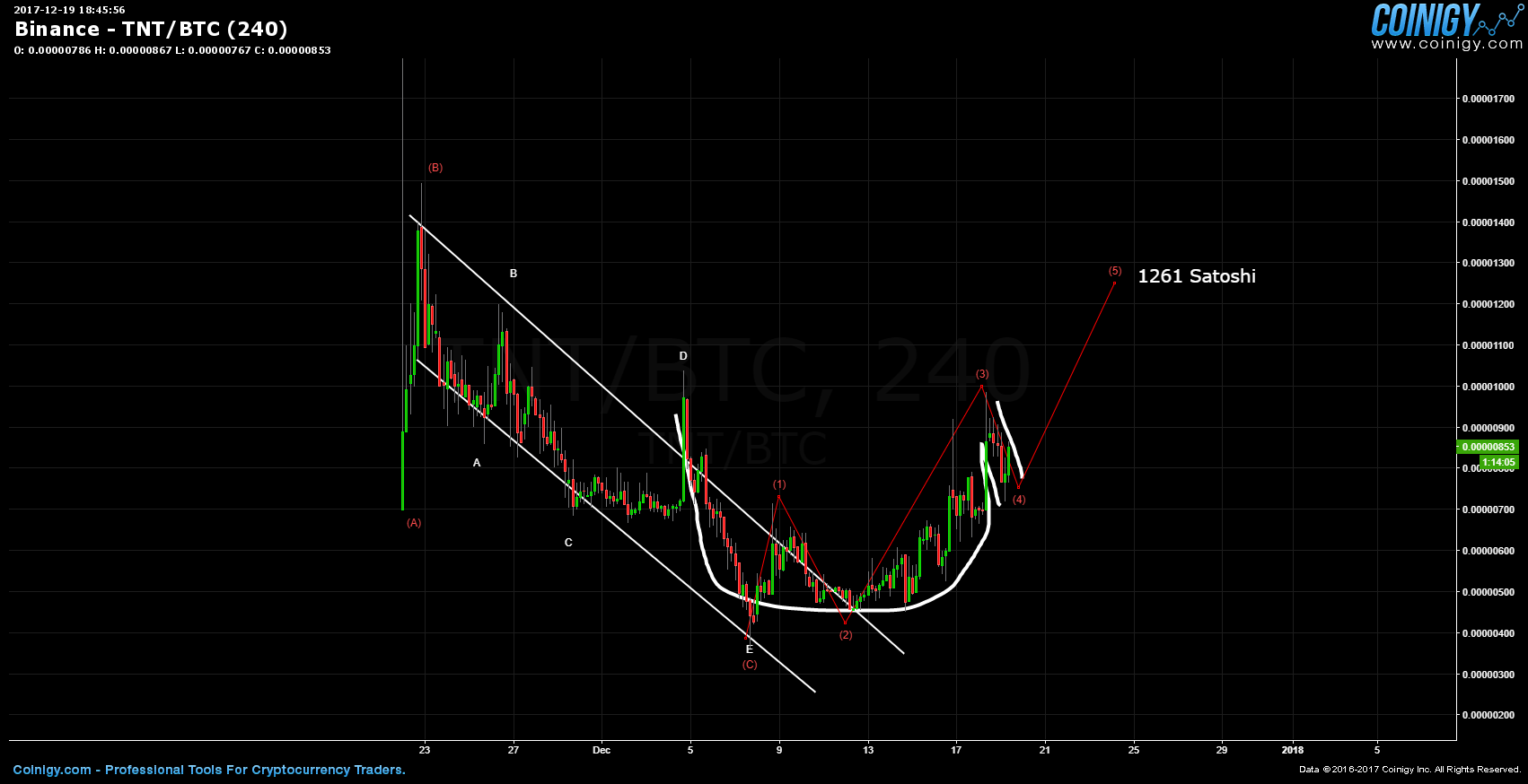 The TNT/BTC pair is actually a bit ahead of the TNT/USD pair! It might explode first! But, does it matter? The Cup & Handle is also uncanny. I've labeled the descending bullish channel with a,b,c,d,e labels which is appropriate.