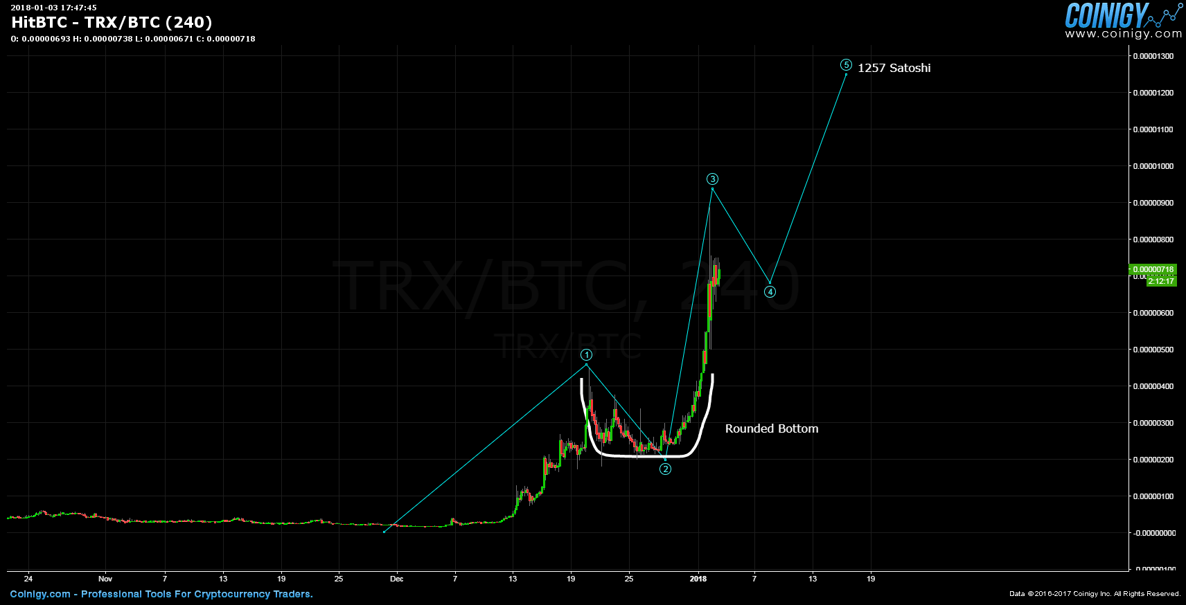Here is the TRX/BTC pair and while a rounded bottom price pattern could be drawn out, it too doesn't have other significant bullish indicators that would help propel it to 10x current price.