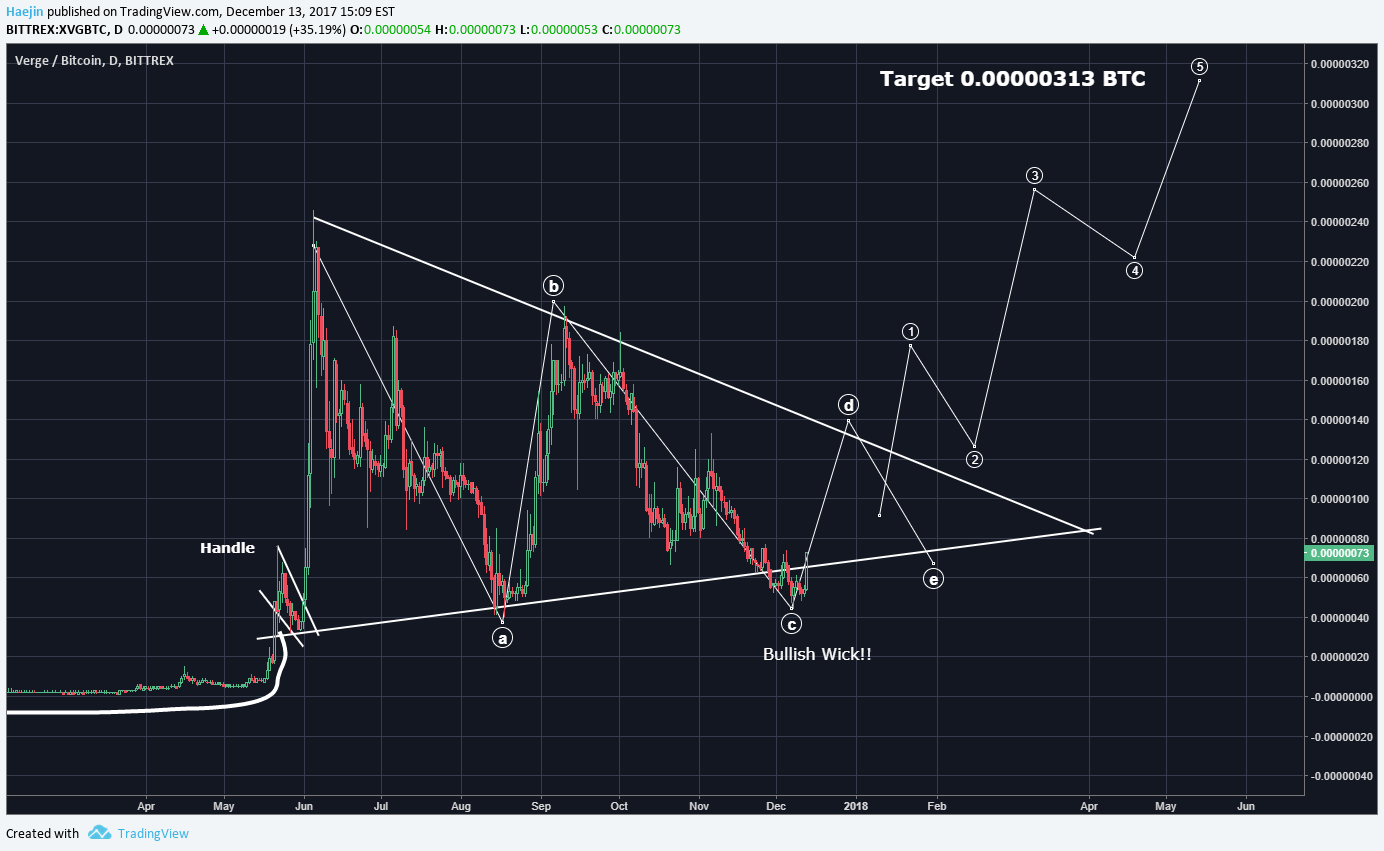 The XVG/BTC has completed a Bullish Wick! This is the way weak hands are divested so as to gain the mojo for the ultra bull run! Once d and e are complete, this baby is gonna make orgasmic lunges towards 0.00000313 BTC!!