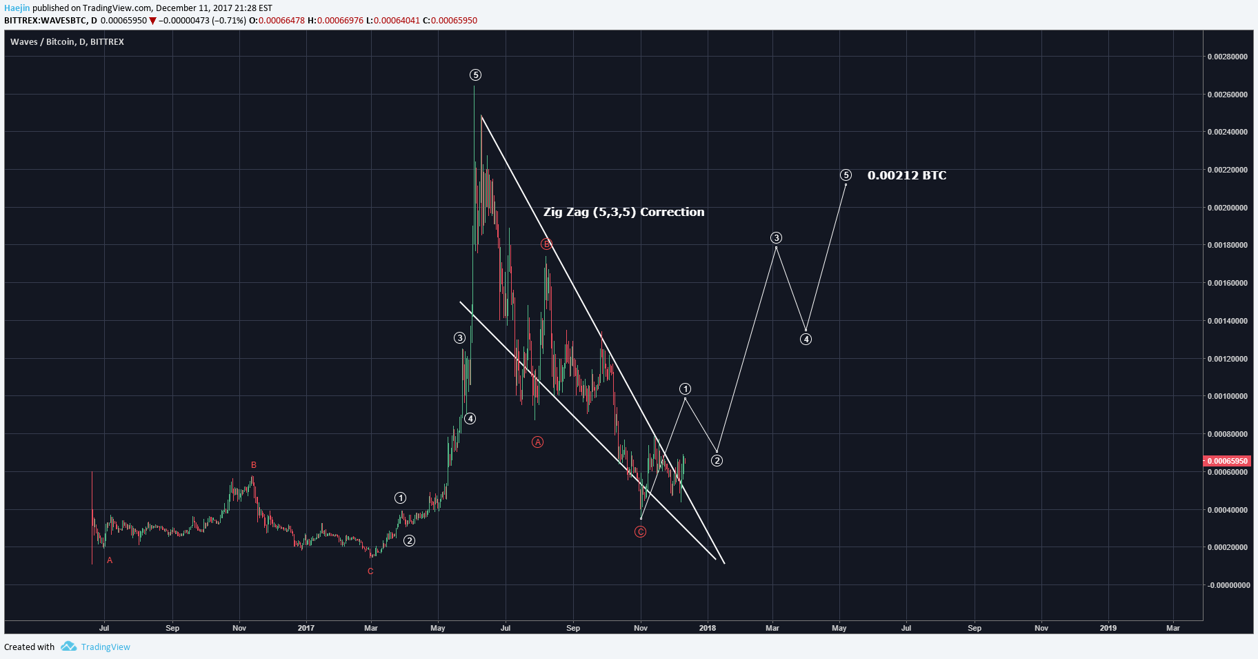 The Bullish Downward Pointing Symmetrical Triangle is a beauty! The zig zag is vintage adherence to Elliott Waves a,b,c type of correction. There seems to be early signs of a breakout and if so, the white waves show the price pathway towards 0.00212 BTC.