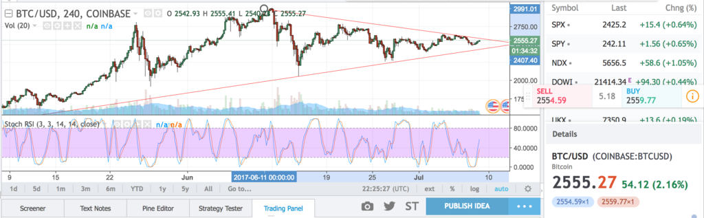 As you can see here Bitcoin is has consolidated into a beautiful ascending triangle formation. A weekly break above $2600 is key which is slightly above the triangle. There is strong resistance at this level so a solid break above $2600 I am expecting to see big % gains the days that follow.