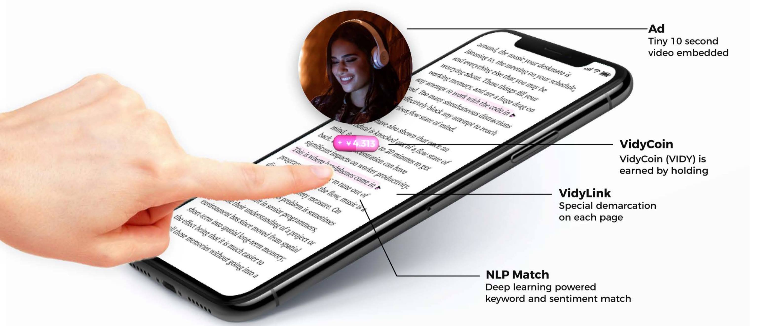 Vidy’s ad placement mechanism is a proprietary open-source NLP protocol, run by miners, that automatically places video ads on a massive scale into the hyper-relevant text of millions of publisher pages.