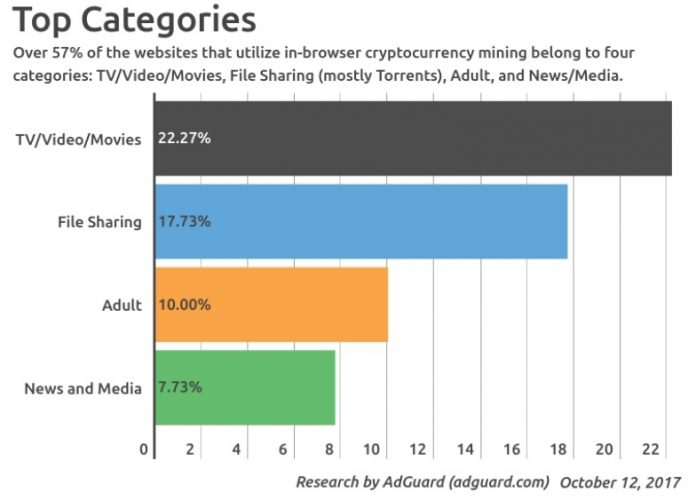 Adguard, which produces an ad blocking program with the same name, recently analyzed websites for cryptocurrency mining scripts following the news that some of them have been using their users’ browsers to mine cryptocurrencies. The top 100,000 websites as ranked by Alexa were inspected. Co-founder and CTO Andrey Meshkov shared his company’s findings on Thursday.