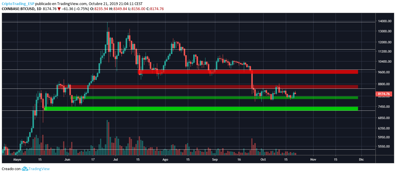 Una vez explicado dónde está atrapada Bitcoin , veamos qué puede ocurrir cuándo se libere. Si lo hace a la baja, debemos observar los 7.400$ - 7.200$ con atención ya que es el siguiente nivel de soporte. Si lo hace al alza, la probabilidad de que regrese hasta los 9.700$ aproximadamente se dispara, ya que habría superado resistencias clave .