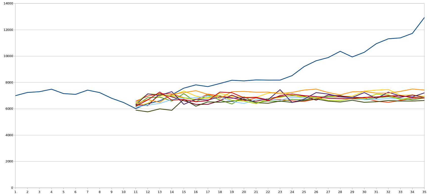 This is the network's prediction for the price action when bitcoin reached it's current all time high (as of April 2018). Unfortunately this shows a rather large flaw in the output. When there is extreme price action, the output is heavily reliant on the previous day's price and is only a little bit better than just predicting that tomorrow's price will be about the same as today's price. The main use of this neural network would have to be: 'assuming nothing that big will happen with bitcoin's price, this is what will probably happen'. If one was to try and forecast using this neural network around the 21st day mark then the network really has no idea when the price will stop rising. In order to get a better grasp on these situations, the network needs more information, perhaps in the form of the number of active users trading bitcoin, the number of new users entering the market and the volume. I'll discuss this more in the next blog where I'll be looking at recurrent neural networks, as in this form giving this data to the neural network is easier.