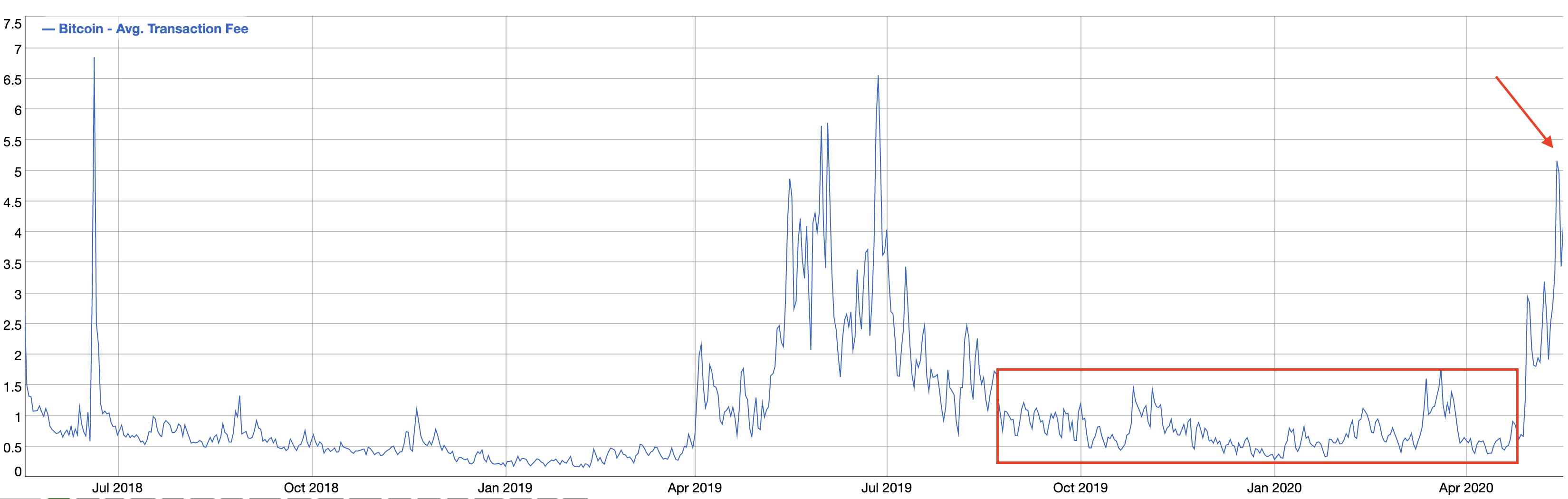 Firstly, the recent $5.16 transaction fee peak contrasts with the average transaction fees between September 2019 and April 2020. During that eight month period, fees hovered in the $0.75 region with their lowest level touching $0.28 and their highest reaching $1.77, as is demonstrated by the red box in the picture below.