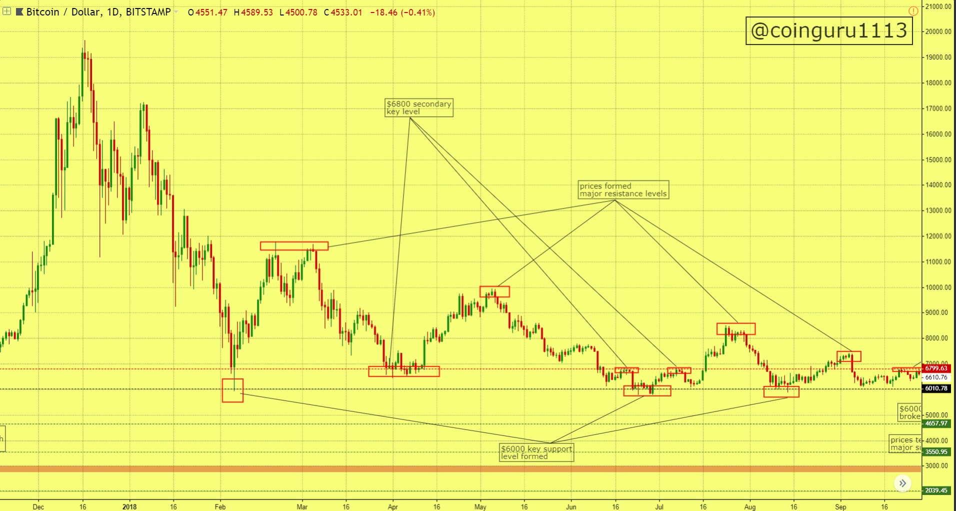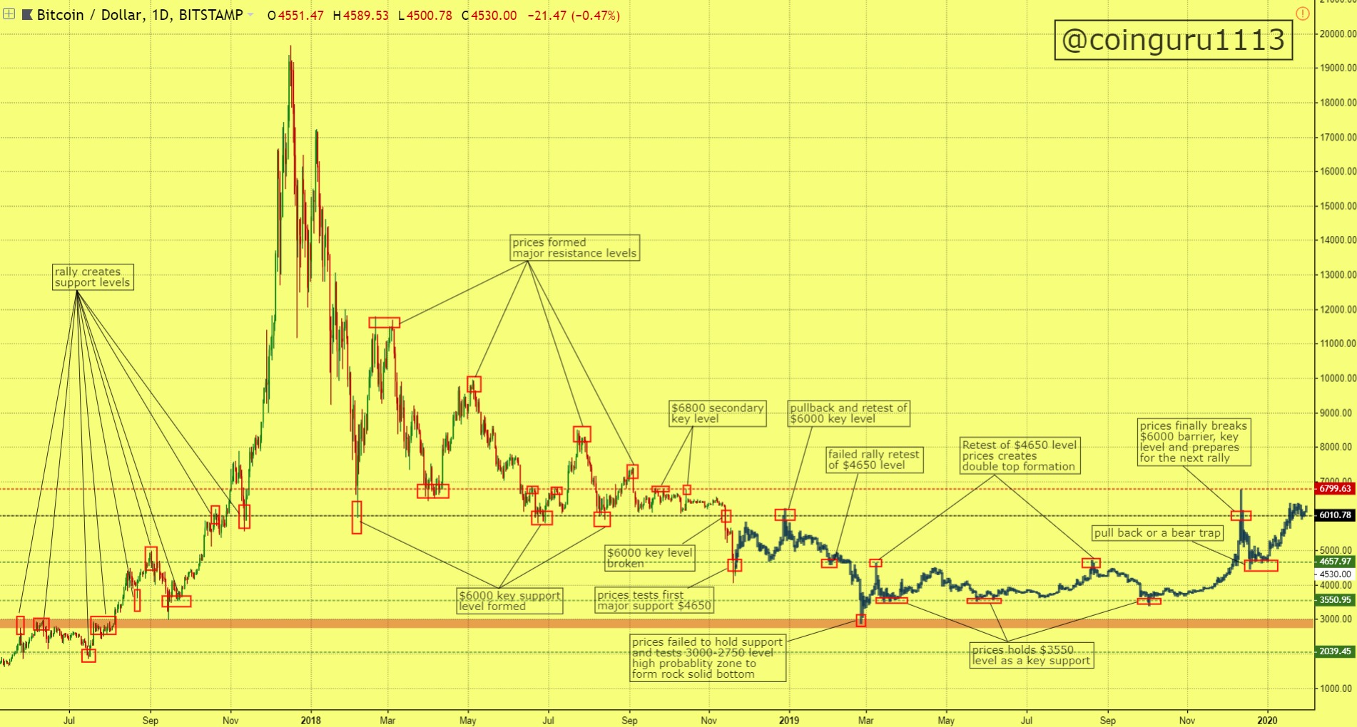 after establishing new all time high of $20000 major resistance levels formed to halt rallies and $6000 act as a key support level.