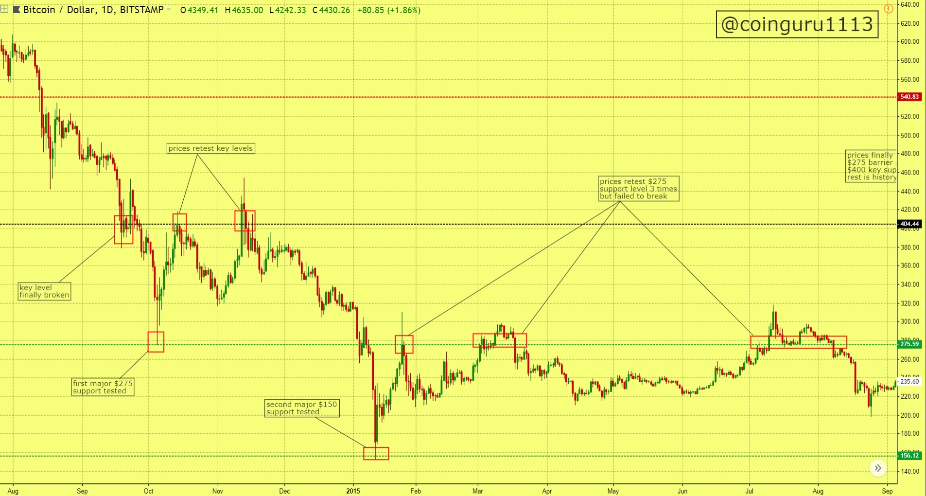 prices finally breaks key level and hits first support of $275. again prices recovers and tests key level twice and forms a double top formation. finally breaks the $275 support and hits $150 level, forms a rock solid bottom and retest the $275 support three times but failed to break it.