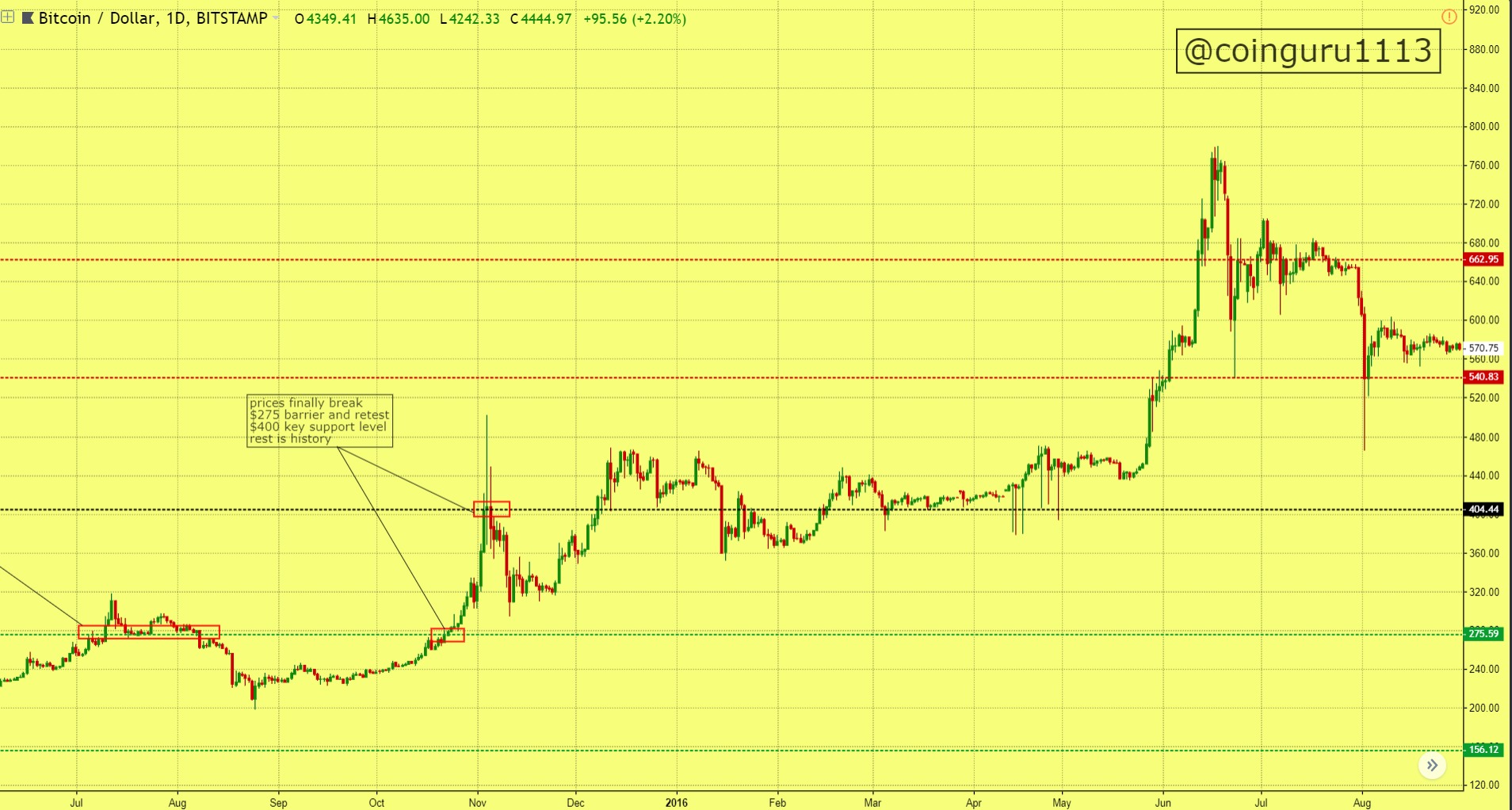 in a forth attempt prices finally breaks $275 barrier and even breaks the $400 key support level, indication for the next rally after a major pullback most likely to be a bear trap, rest is history...