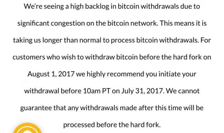 It seems it’s been a difficult few days for the bitcoin exchange Coinbase as the company has been processing a lot more withdrawals lately due to the upcoming August 1 fork. Over the past couple of days, customers have been complaining of twelve-hour delays to get their funds off the platform. Coinbase addressed the problem a few times via Twitter stating;
