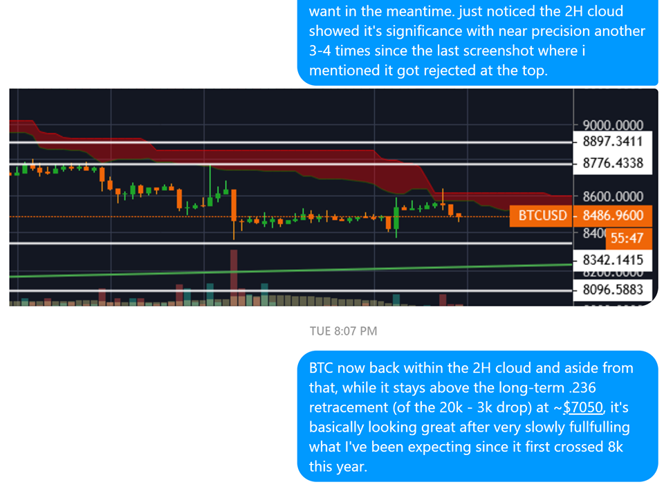 Since then, it's dipped down to just above my "line in the sand" I mentioned in the tweet at $6450 and reacted to the 2H ichomoku cloud exactly as I started to expect it to from a couple days ago when I mentioned it to my friend again.