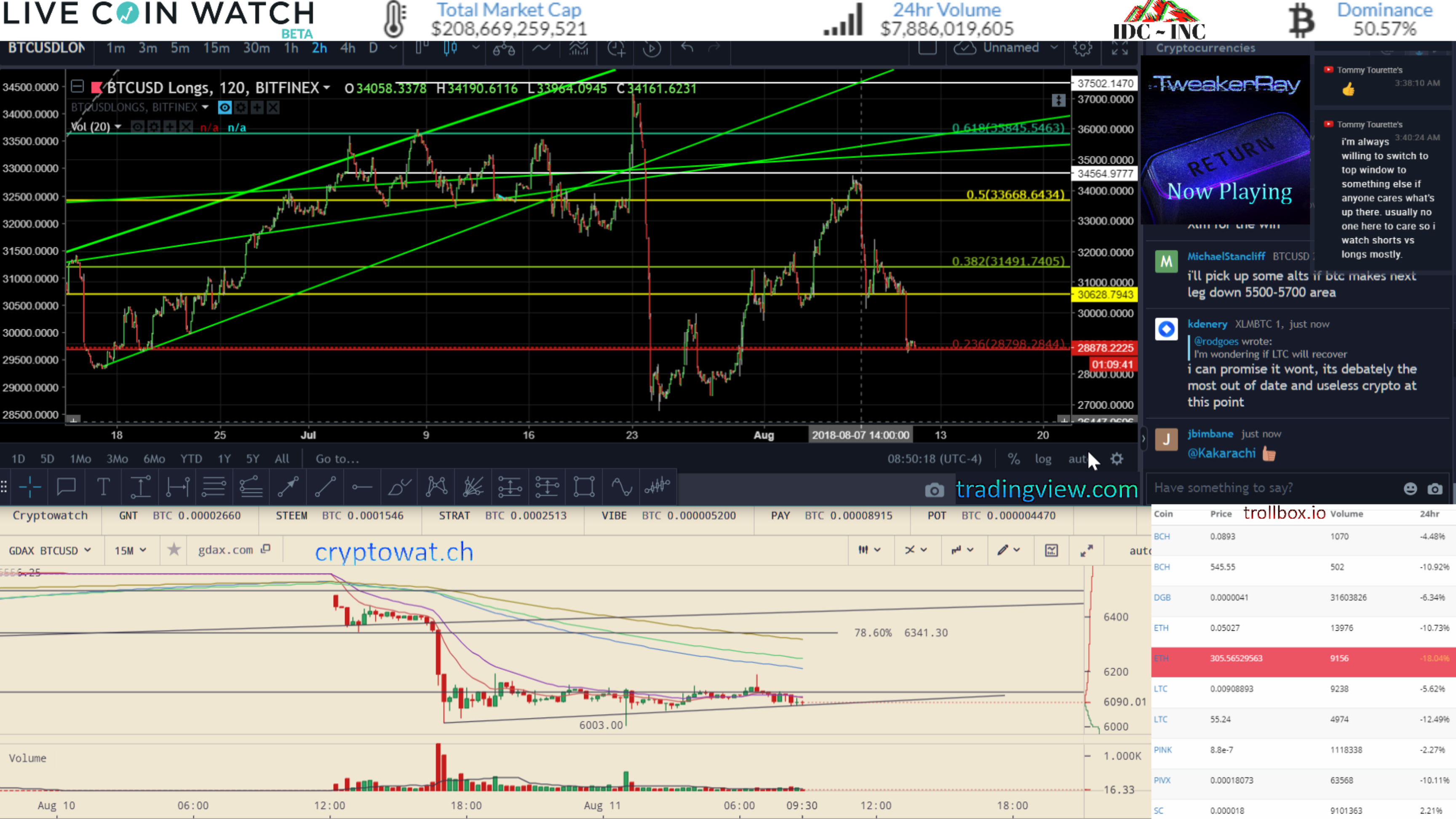 Update (Aug 11, 08:55 EST): And below is what BTC looks like my livestream chart and a 2H chart of BTCUSDLONGS. The line that BTCUSDLONGS is resting on right now is the .236 extension of the XA leg from the PRZ of a bullish gartley I posted months ago. BTCUSDLONGS recovered from point B of the afformentioned bullish Gartley late last month, while BTCUSDSHORTS just started reversing from point A of the bearish butterfly I also posted earlier this year.