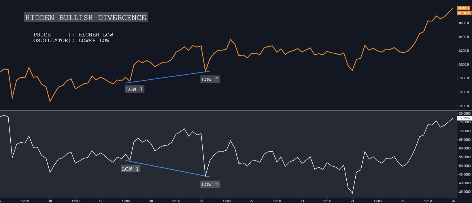 Indicates underlying strength. It occurs during retracements in an uptrend. Nice to see during price retest of previous lows. It’s good entry point for opening new positions or add to the existing positions. In the chart above, you can see the that the price is making a higher low(Low 1 < Low 2) while the oscillator is making a lower low(Low 1 > Low 2).