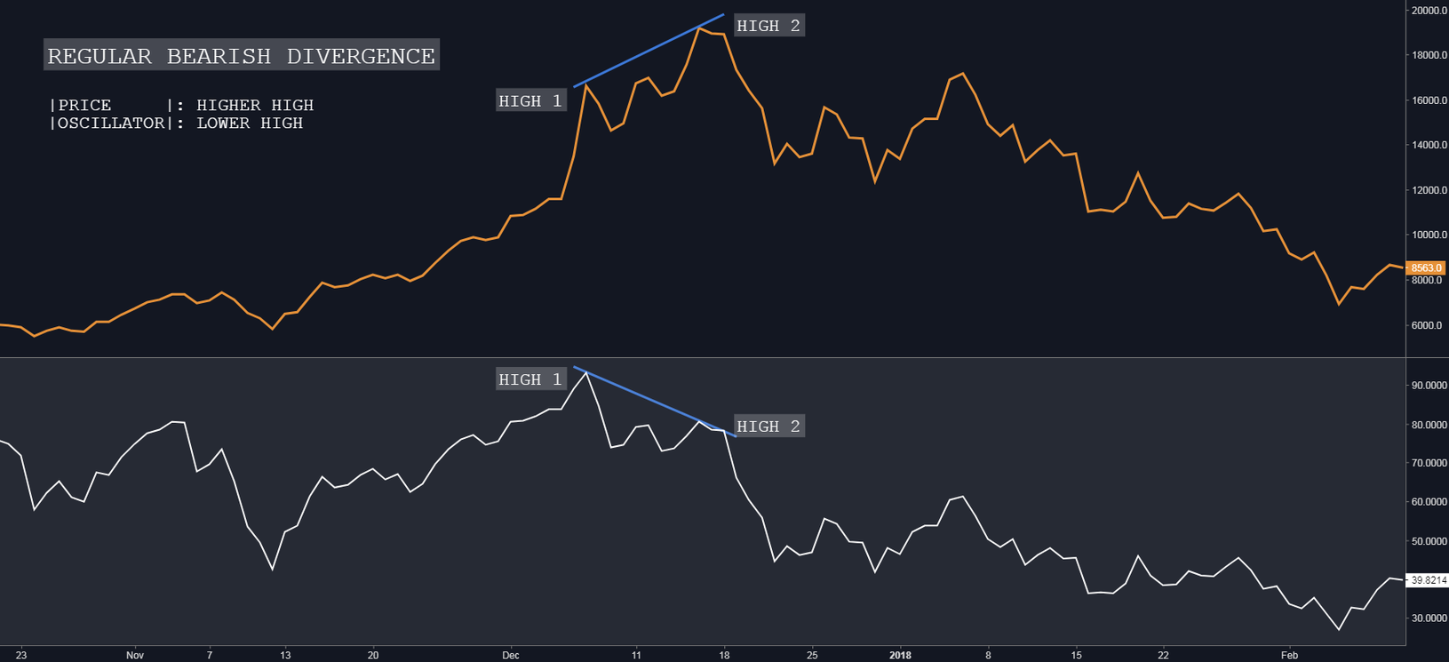 Indicates underlying weakness. It marks the exhaustion of Bulls. It’s an indication of possible trend direction change from uptrend to downtrend. In the chart above, you can see that the price is making a Higher High(High 1 < High 2) while the oscillator is making a Lower High(High 1 > High 2).