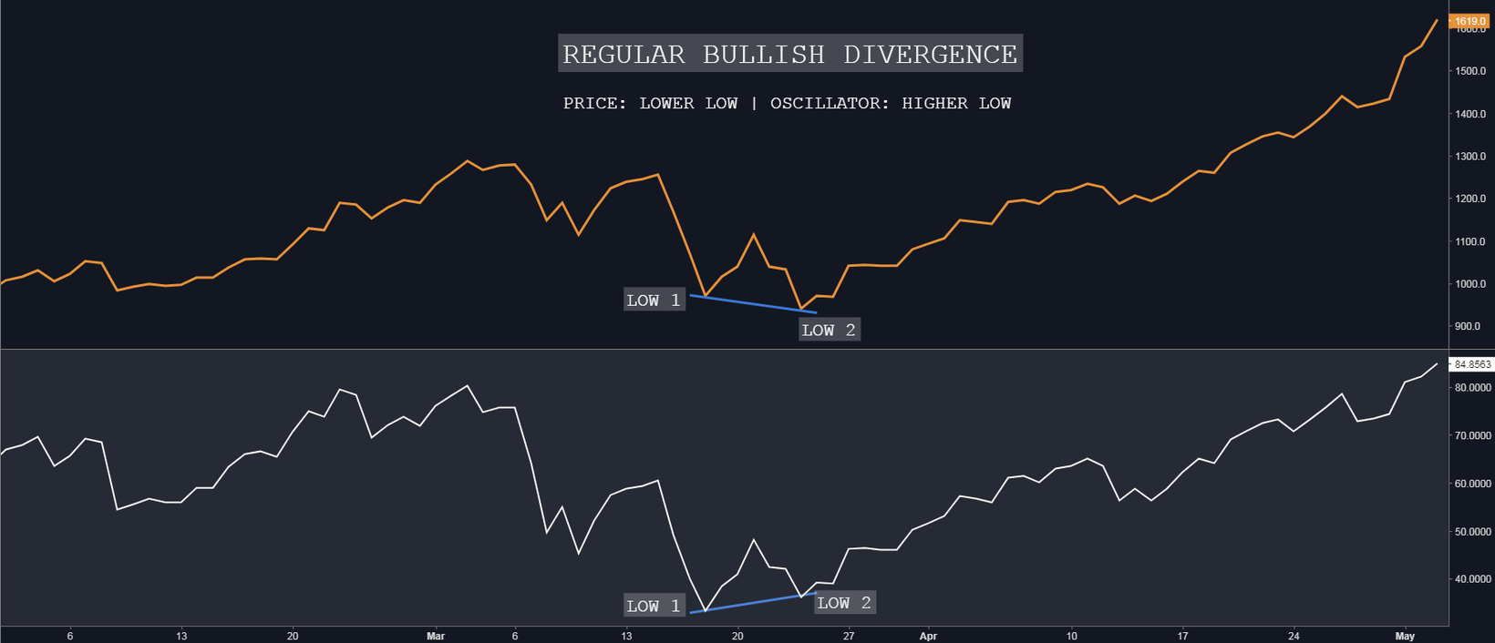 Indicates underlying strength. It marks the exhaustion of Bears. It’s an indication of possible trend direction change from downtrend to uptrend. In the chart above, you can see that the price is making a lower low(Low 1 > Low 2) while the oscillator is making a higher low(Low 1 < Low 2).