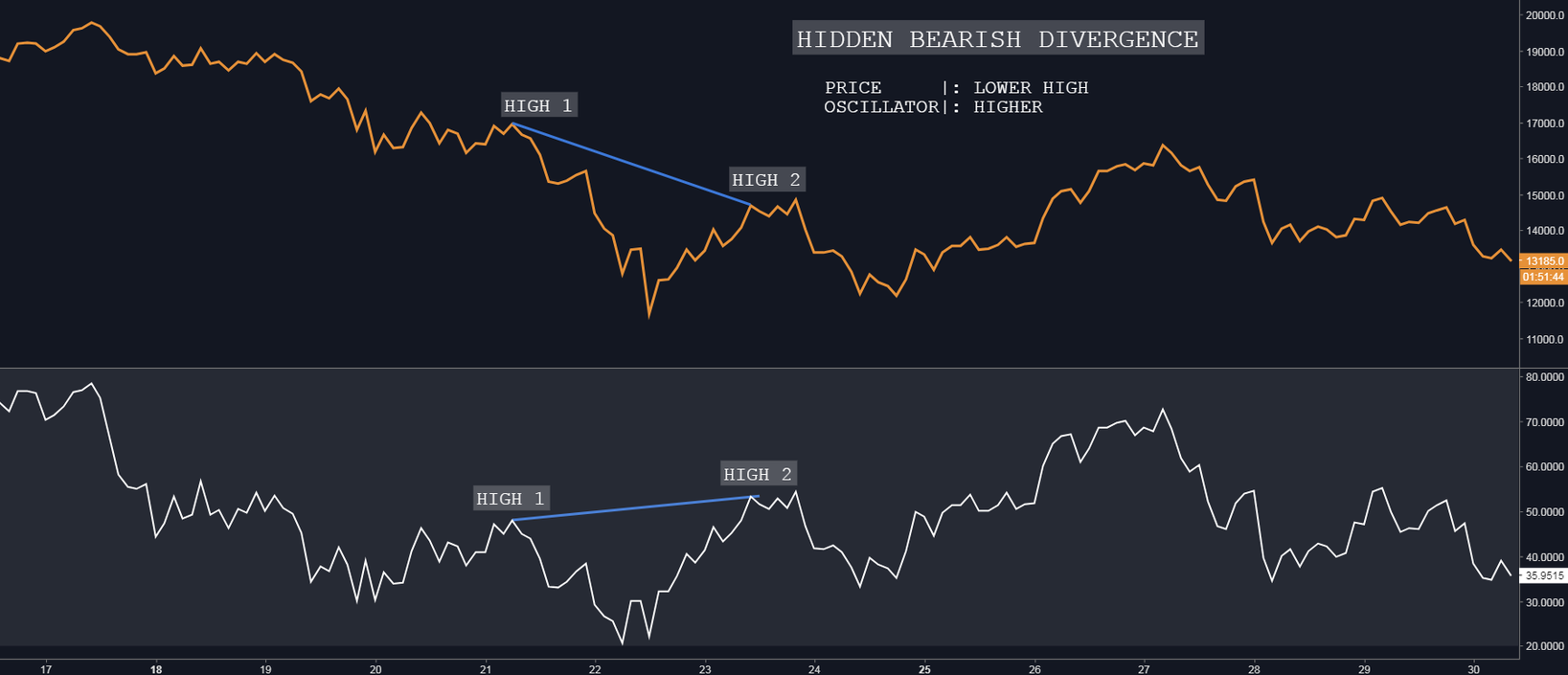 Indicates underlying weakness. Found during retracements in a downtrend. Nice to see during price retests of previous highs. It’s a good exit point for longs and a good entry point for shorts. In the chart above, you can see the that the price is making a lower high(High 1 > High 2) while the oscillator is making a higher high(High 1 < High 2).