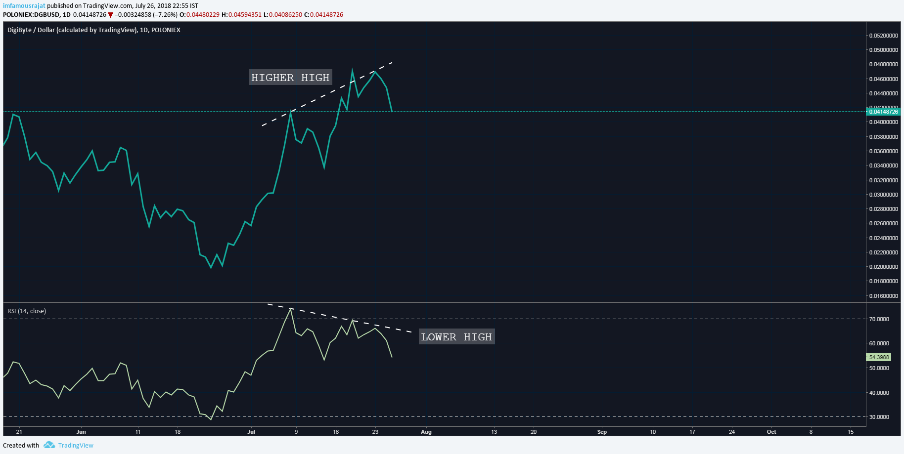The RSI is showing Bearish divergence with the price forming Higher High but the RSI forming Lower High.