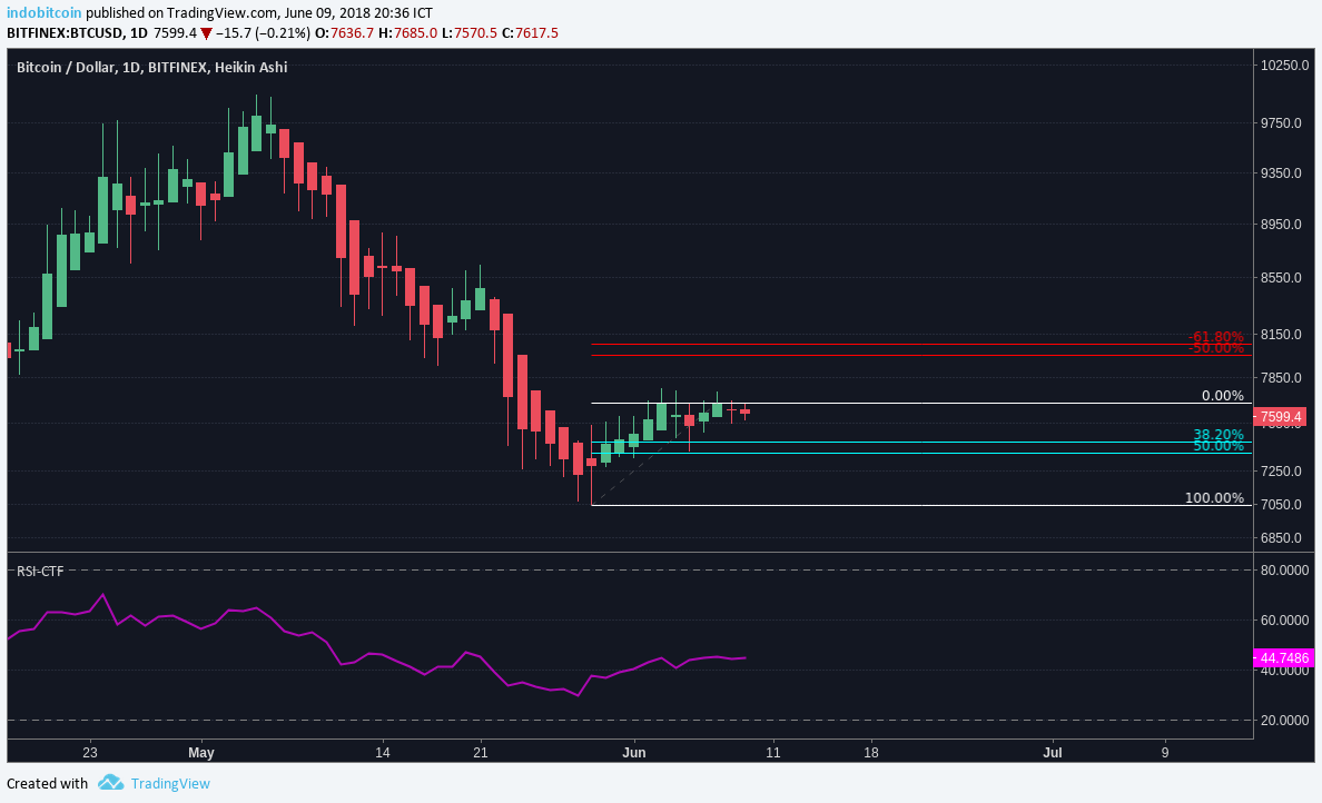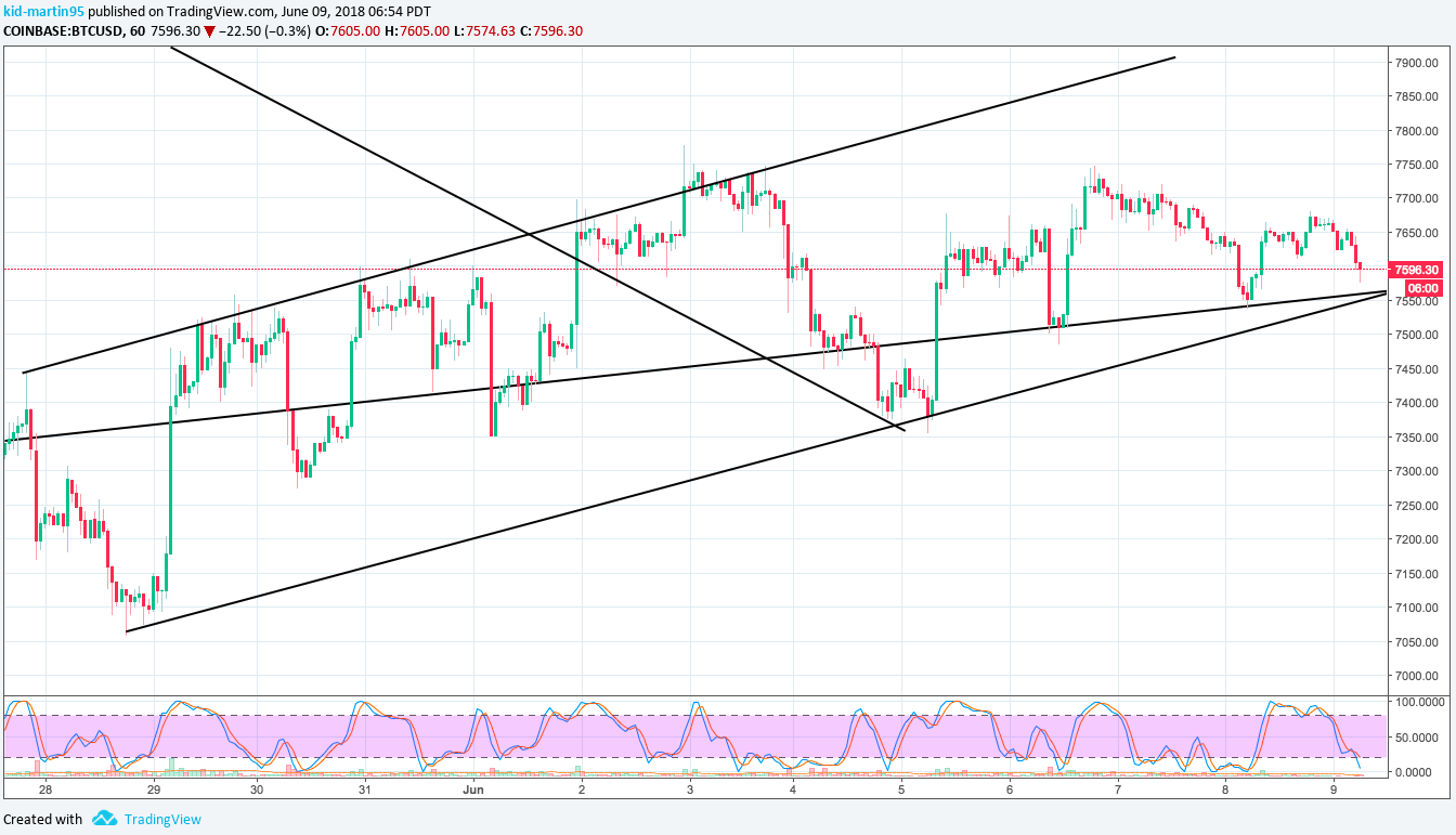 Bitcoin is struggle to go up in the past few days and recently The pair is currently trading well around the $7.6K. Several high was formed at $7.7k this level acted as resistances, Bearish Divergence is spotted indicating the pair may continue to struggle or the price likely to go down to test nearest support level soon.