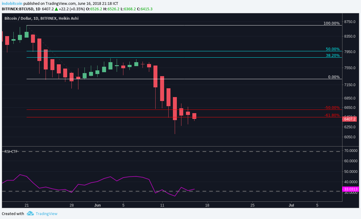 Daily chart is showing the downtrend is weakening, the printed candle is getting more shorter as the price entering support level area between $6400 & $6600, RSI is entering Oversold Level. This indicating the price may consolidate in this area but for now the overall price action is still bearish.