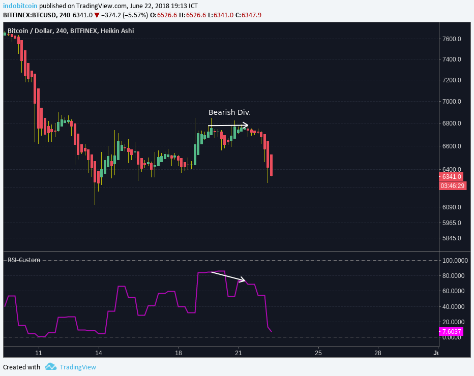 Bitcoin was declined heavily against the US Dollar in the past 24 hour and recently the pair is currently trading well below the $6400. Bitcoin price was failed to break the $6800 resistance before the price started declined sharply against the US Dollar, also Bearish Divergence was formed indicating the weaknesses of bull trend. RSI is approaching Oversold Level so hopefully the correction will slow down in near term.