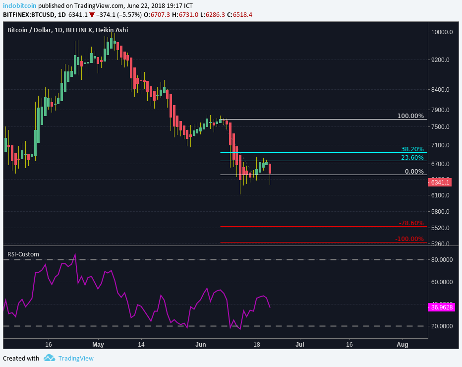 Daily chart is still showing the bearish sign, RSI also pointing down indicating the momentum is shifting to go downside. The next price target is between $5.3k & $5.5k if price is struggle to close above support at $6400.