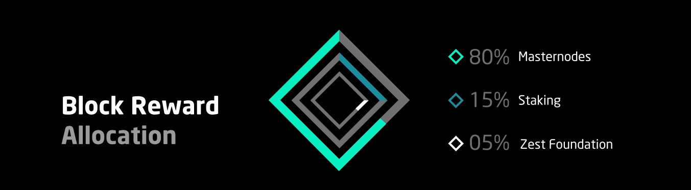 Zest is an intuitive, easy-to-use network that uses a fixed block reward system of 80% to Masternodes,