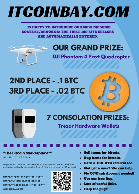 Better yet, become a site Seller and in addition to Buying privileges you can sell your own items or services for bitcoin, you can earn with our Referral Program--.001 BTC per new Seller and you are entered into our New Member Contest with a 1 in 10 chance to win, and to possibly win big. Second place is .1 BTC, take a look at our flyer for the Grand Prize.