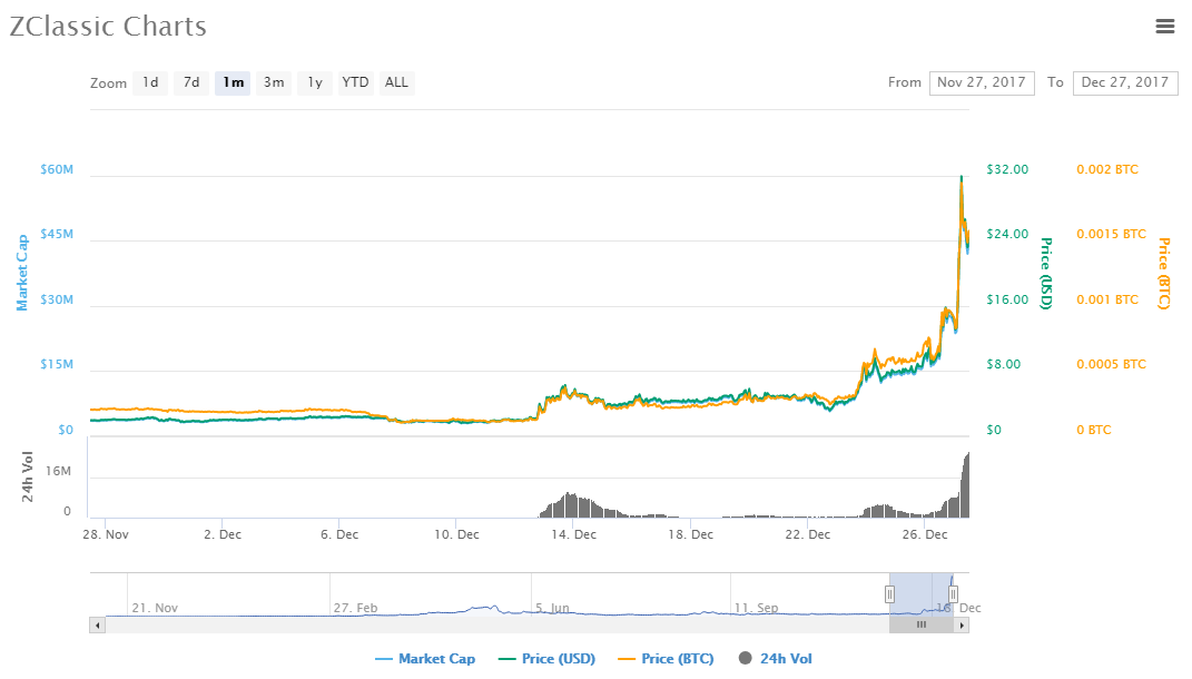 And now have a look at the chart of Zclassic. 1 month ago trading at $2.00 and now $24.00. That's a solid 12 x. And you know what's the scary part?.. this is just the beginning. From this level, $24, we can still go 20x or more!