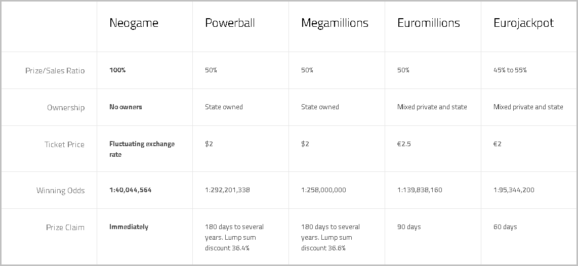No lottery in the world offers such conditions for players as Neogame. It gives all raised funds to winners, while other lotteries usually leave 50% of funds for themselves and their projects. Moreover it’s up to 7 times more likely to win a jackpot with Neogame than with most popular lotteries. It is fully anonymous and winners can take their prizes immediately.
