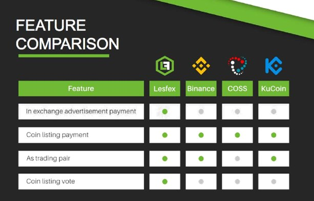 Lesfex абсталяванне, прафесійнае і вельмі выбарча ў аналізе, праводзіць праверкі выканання ўсіх новых манет і рэалізаваць метад , каб гарантаваць , што карыстальнікі маюць доступ да ўсёй інфармацыйнай платформе дзейнічаць бяспечна ім трэба. Гледзячы на памер новых манет трапілі на рынак, гэта азначае , што ёсць шмат будучых праектаў ICO, пералічаных у стварэнні сімвалічных гандлёвых абменаў, а вось Lesfex- гатовыя абслугоўваць рынак.
