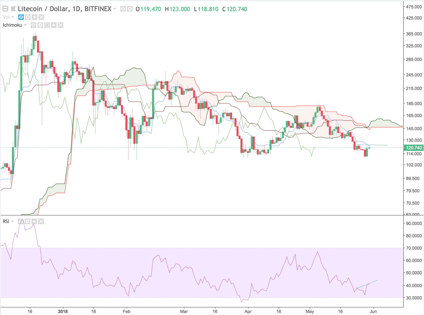 Using Ichimoku Clouds, we see that Litecoin is also below the cloud and is forming a bearish cloud. A bearish TK-Cross is still a bit of a way off from forming, but if it does could spell even more downside for Litecoin. It is testing the Tenkan-Sen which is the faster moving average, so keep an eye out for how it reacts to the level.