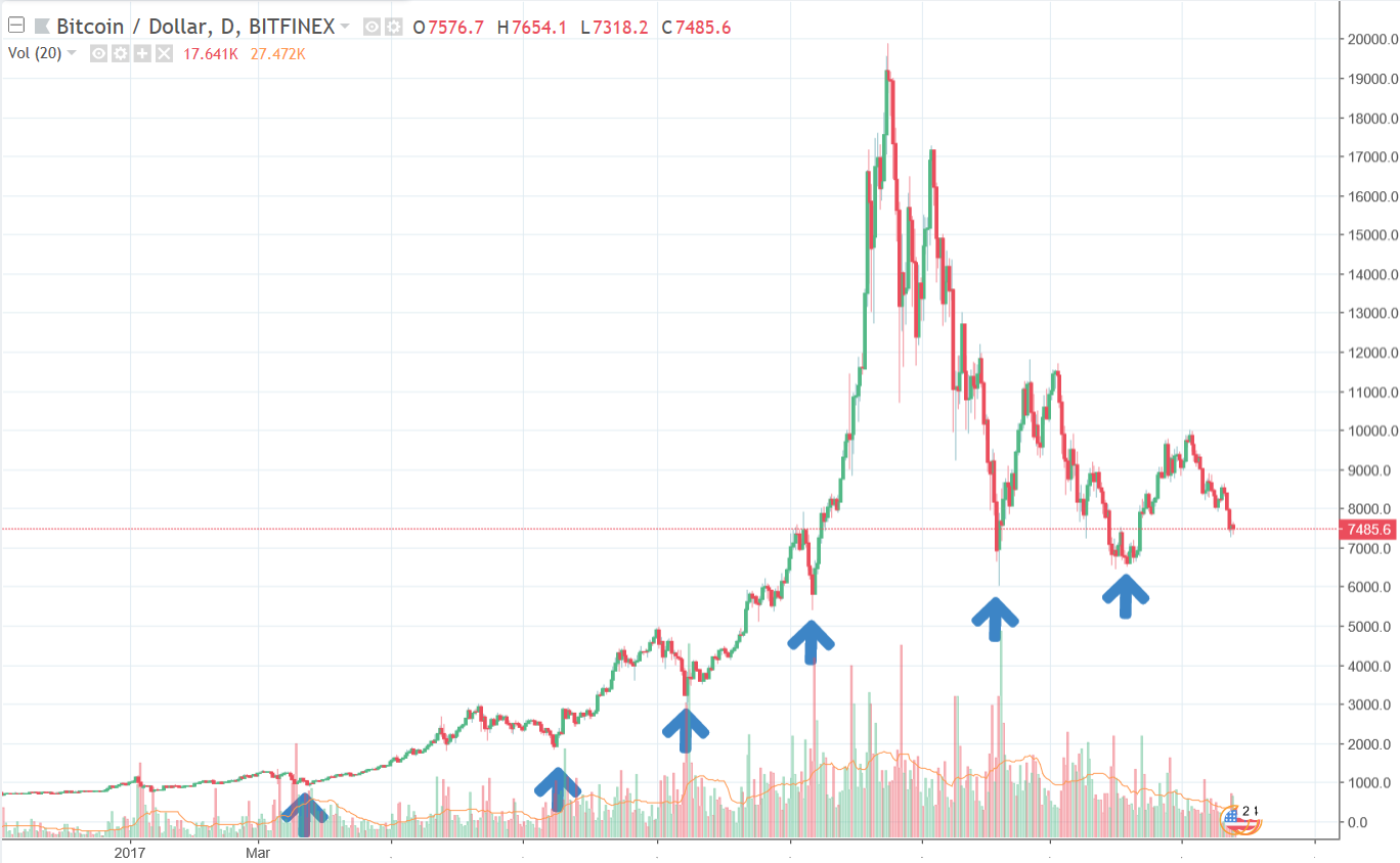 A quick look at the graph shows that bitcoin is still in its bullish trend and nothing has changed since the beginning of 2017 (and even earlier). The arrows on the graph point out the lows after each time that bitcoin set an ATH. It is clear that for a very long time we haven't got any lower lows, which means that the bullish trend is intact.