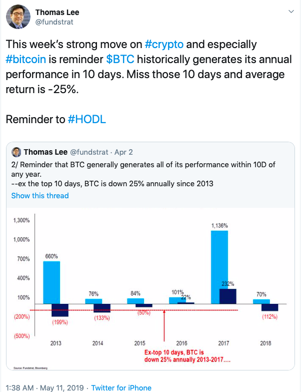 Bitcoin basically makes all its gains for the year in 10 days. If you miss those 10 days, bitcoin loses money every year.