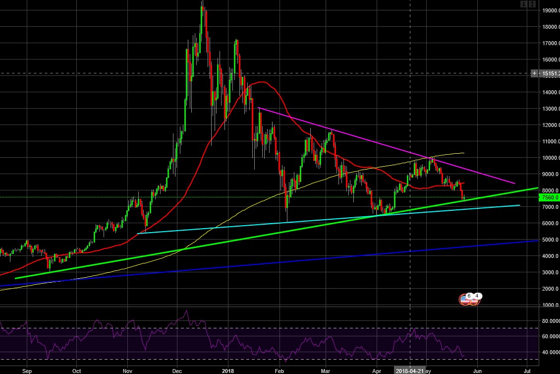 If the 0.768 Fib level at around 7200 usd doesn't hold, it's very likely the price will keep falling towards 6500 where we saw support in April. The baby blue trendline could still save BTC if 7200 fails. If the price somehow falls below 6500, then the price would obviously test the previous low at 6000. If 6000 fails too, there's really nothing to keep the price from falling to 5000 where a support zone could be met with another trendline going up. However, It's way more likely that BTC goes closer to 9000 than 6000 in the near future.