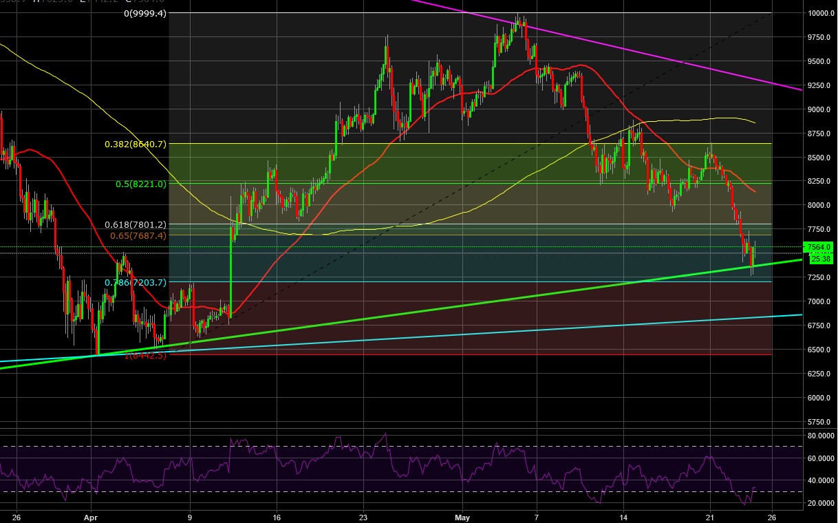 I haven't considered the green trendline as an equally important support as the baby blue line, but the price has nevertheless found some support there. It probably helped that the 0.768 Fib level was right below it. I had waited for a few days for the price to drop near 7200.
