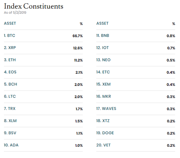 Wave Financials initial index offering is comprised of 20 assets designed to represent the overall digital asset market, and currently covers ~95% of market cap. Of interest is privacy coins like Monero and Dash have been omitted from this index in order to avoid compliance issues. The complete list can be found on Wave Financials Index page.