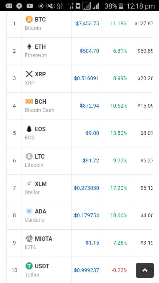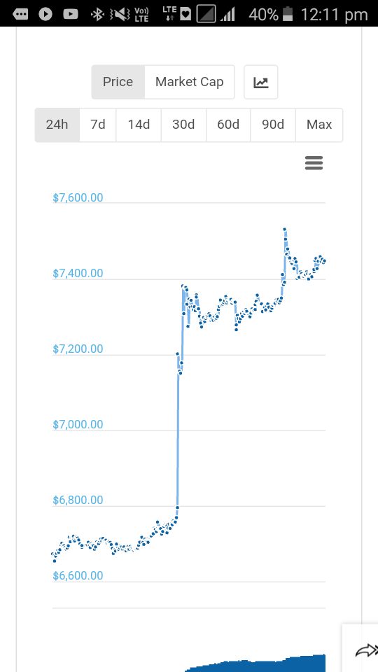 From previous few months Bitcoin was in correction period . despite so many positive news it was not increased rather it had fallen below $6000 strong support level. But from last 3 or 4 days Bitcoin is showing a very good increase as today it jumped and touched the $7500 level. From past 24 hours BTC is about 12 % Up. This is a very fast and god growth for Bitcoin as from last night it jumped from $6700 to $7500 till now . Also the total market Cap is jumped from around $ 270 billion to $ 300 billion .