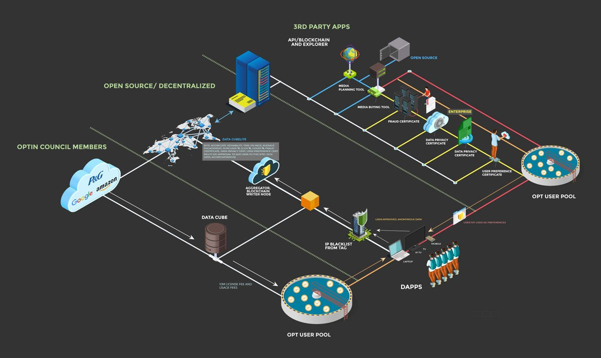The currency that will tie it all together. Using blockchain technology, OPTin tokens will be used to purchase ad space and encourage users to provide anonymous behavior data for 100,000 web properties.