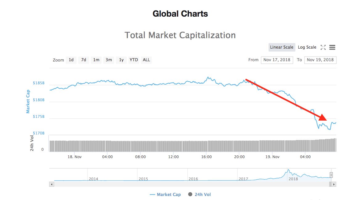 Bitcoin tuvo una enorme baja el día de hoy que se suma a la caída generalizada de las criptomonedas el pasado 14 de noviembre en paralelo a la bifurcación de Bitcoin Cash. Hay desconfianzas y temores que han llevado en estos días el mercado a la baja. Asimismo, la caída generalizada de las bolsas de valores ha influido también en el mundo cripto.