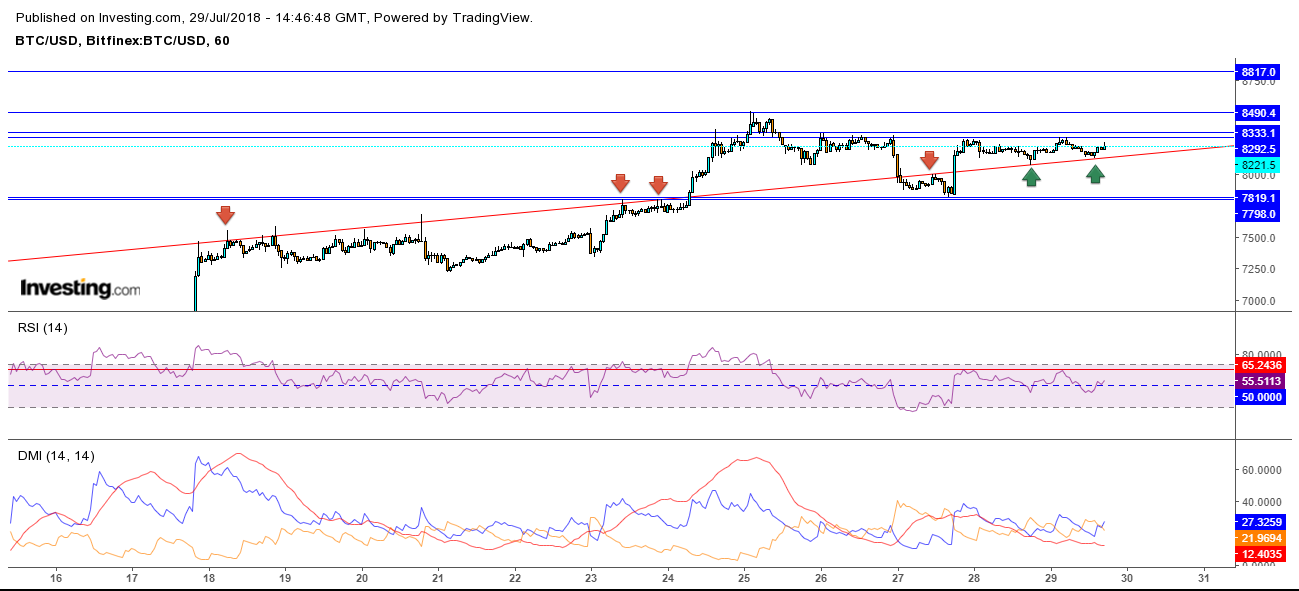 Eğer fiyat kırmızı trend çizgisini aşağı kırarsa fiyatda 7798-7819 bandına kadar geri çekilmeler görülebilir.