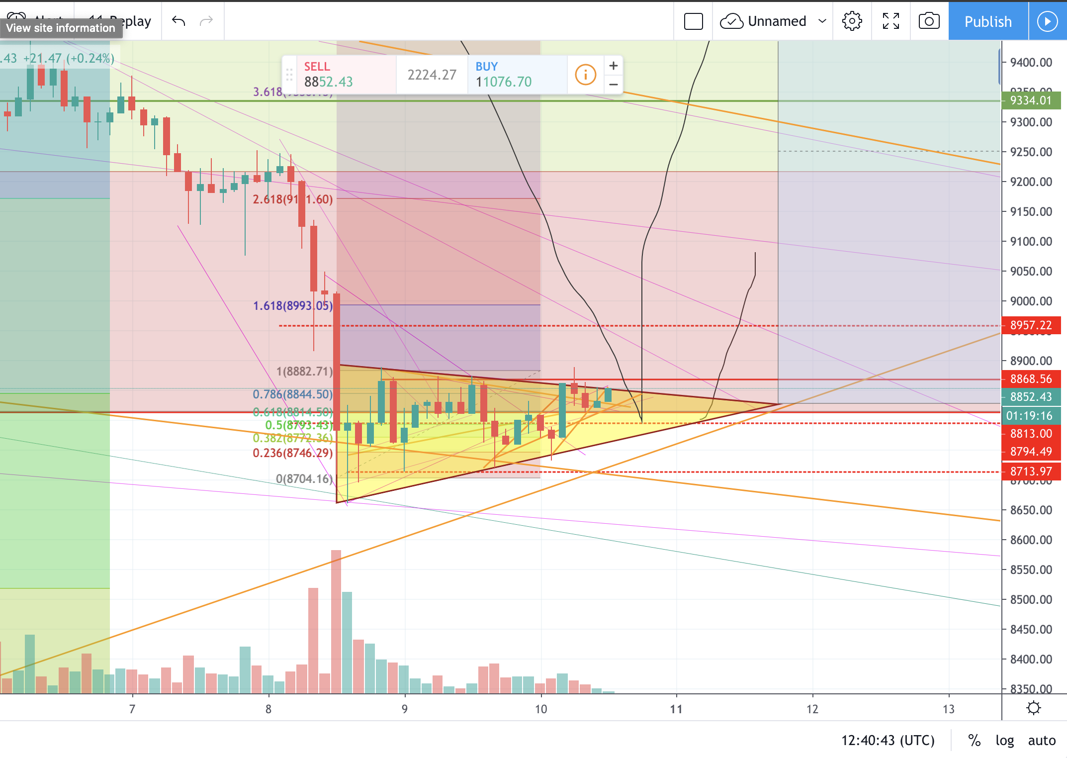 We jumped up out of this yellow bearish triangle to $8,888 for a hot second which is a good sign but the over all trend is downward.