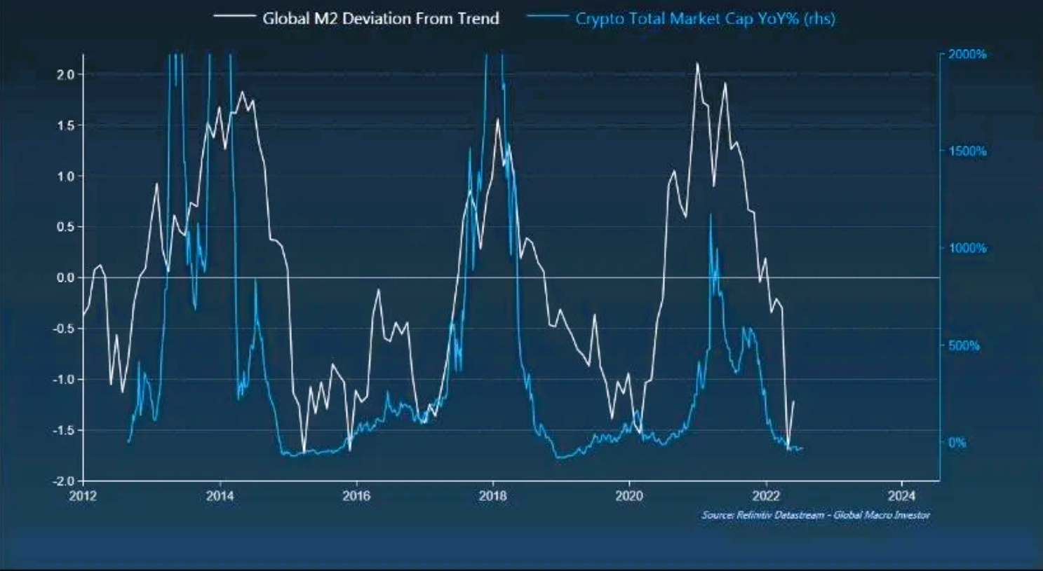 More importantly though, as prices surged higher over the past year and Bitcoin’s price plummeted, the argument shifted to “Bitcoin is a hedge against monetary inflation,” meaning that it doesn’t hedge against a rise in the price of goods and services per se, but against the “devaluation of currency through money printing.” The chart below is used as evidence for this claim.