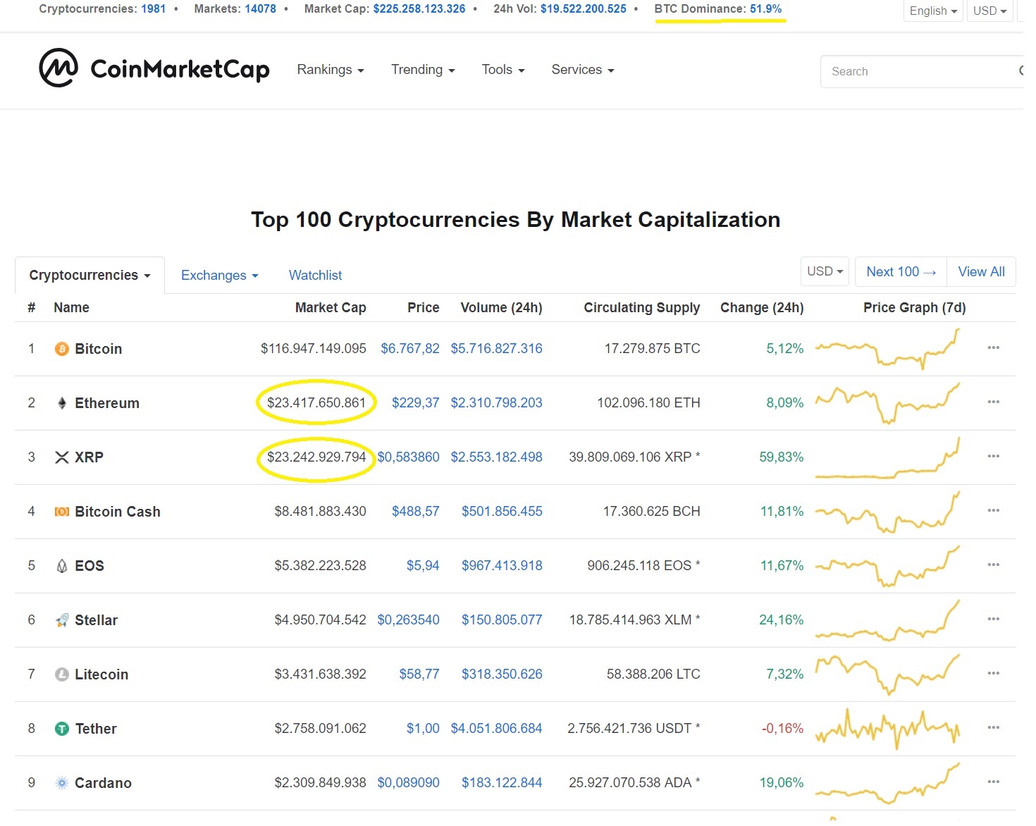 Questa ascesa del prezzo sta portando Ripple a superare nuovamente Ethereum dopo la "bolla" di dicembre 2017: ci troviamo infatti a poco più di 100 milioni di dollari di differenza tra le due Market Cap.
